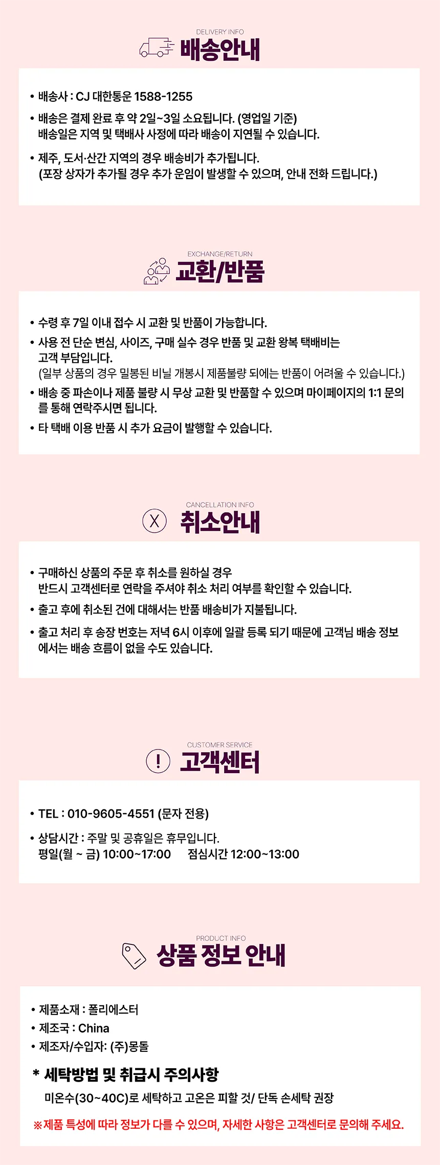 구매자 단순변심 : 상품 수령 후 7일 이내(구매자 비용 부담)