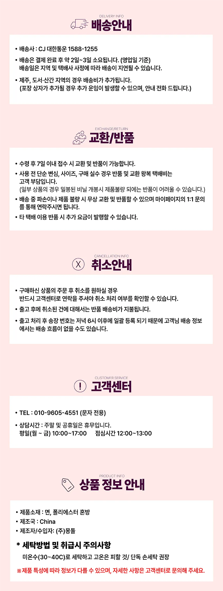 구매자 단순변심 : 상품 수령 후 7일 이내(구매자 비용 부담)