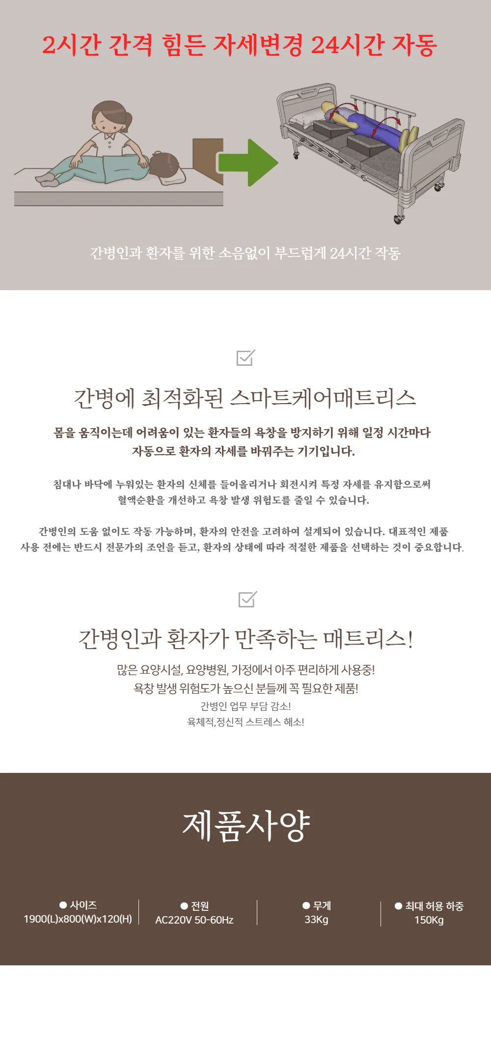 몸을 움직이는데 어려움이 있는 환자들의 욕창을 방지하기 위해 일정 시간마다 자동으로 환자의 자세를 바꿔주는 기기입니다. 침대나 바닥에 누워있는 환자의 신체를 들어올리거나 회전시켜 특정 자세를 유지함으로써 혈액순환을 개선하고 욕창을 예방할 수 있습니다. 간병인의 도움 없이도 자동 작동 가능하며, 환자의 안전을 고려하여 설계되어 있습니다. 일정한 시간간격으로 24시간 자동 체위변경, 압력분산, 에어분사 하는 매트리스이다.