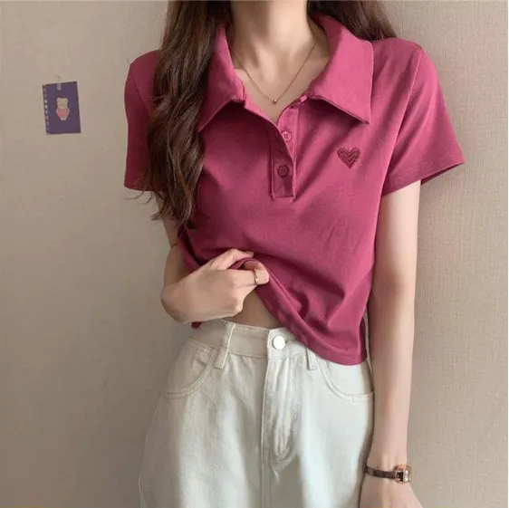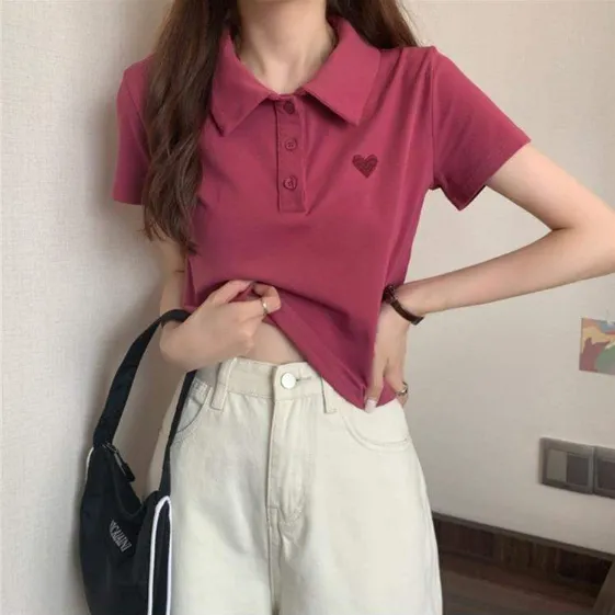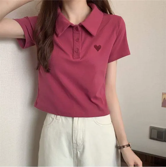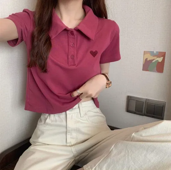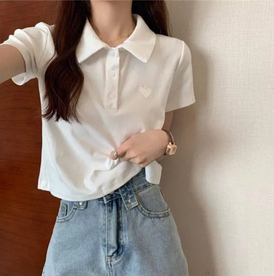 하트 자수 카라 크롭 티셔츠로 스타일을 완성해보세요!💛
