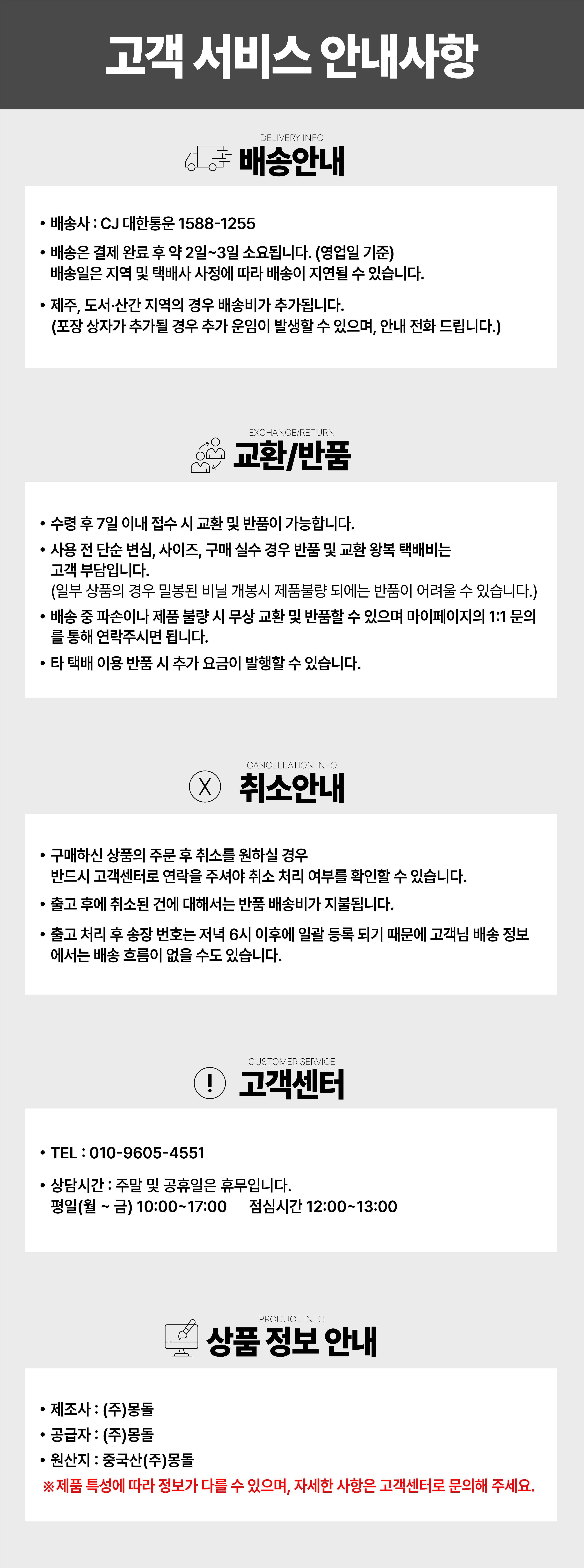구매자 단순변심 : 상품 수령 후 7일 이내(구매자 비용 부담)