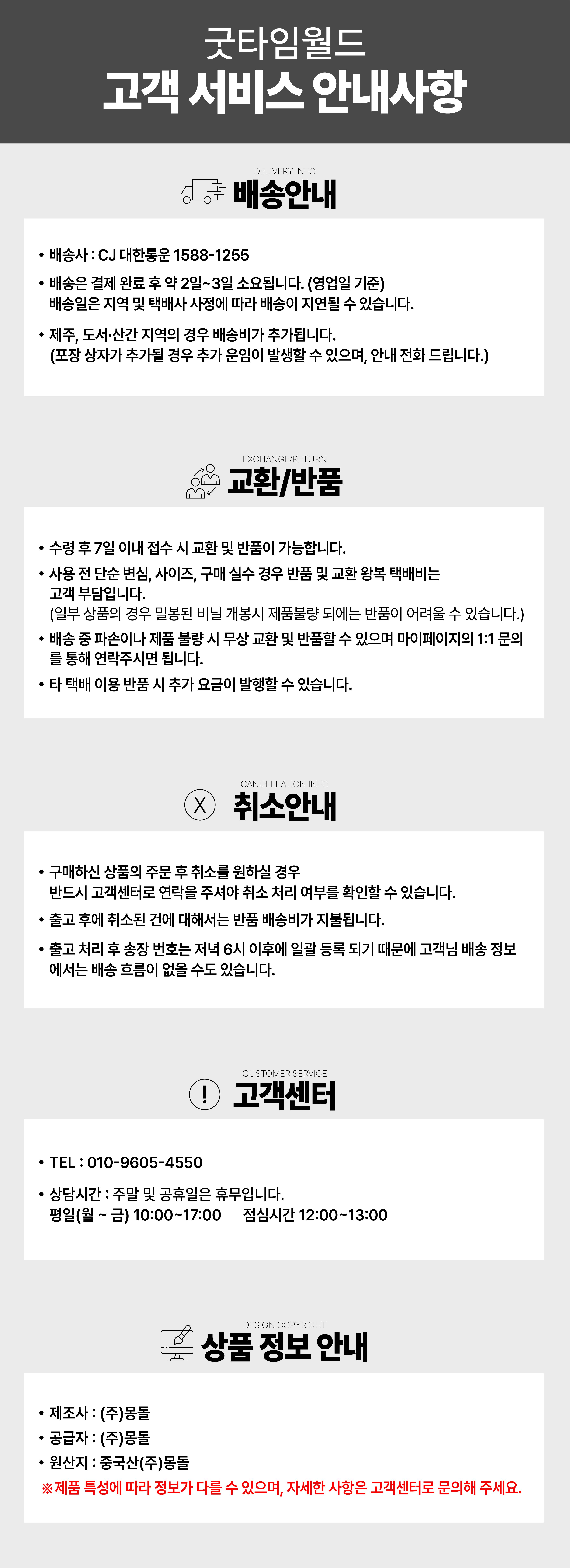 기타, 상품 반품/교환 및 상품 결함 등의 보상은 소비자분쟁해결기준(공정거래위원회 고시)에 의하며 이로인한 분쟁해결 등 사후처리는 구매자께서 판매자와 직접 수행하여야 합니다.